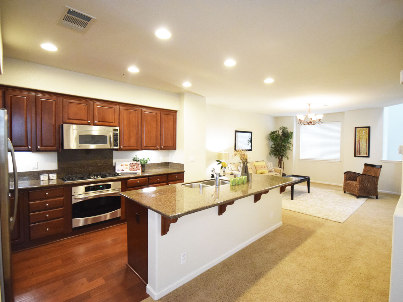 Premium 3 bedroom, 3.5 bathroom corner unit with southwestern exposure overlooking the greenway! Light-filled open floor plan is perfect for entertaining. Gourmet kitchen includes: granite counters, hardwood floors & stainless steel appliances. Large Master bedroom suite with walk-in closet and separate shower & tub. Additional 2 bedrooms for the family, guests or home office. Separate laundry room, attached 2-car garage & storage galore!